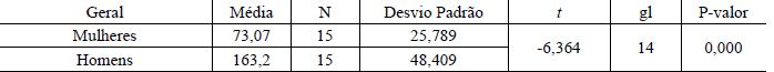 O teste t para o conjunto dos eventos confirma a grande e significativa diferença entre as participações de homens e mulheres, indicando maior participação de homens.