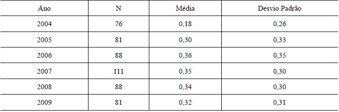 Numa análise das médias e desvios-padrão da proporção de mulheres em relação à quantidade de autores nos artigos publicados no Congresso USP (Tabela 4), nota-se que, a partir de 2005, há um crescimento nessa proporção, ou seja, verifica-se um contínuo aumento, apesar de discreto, na proporção de autoras dos trabalhos publicados. Ressalta-se ainda que os desvios-padrão parecem não variar ano a ano.