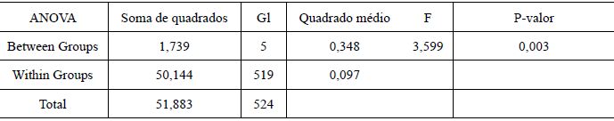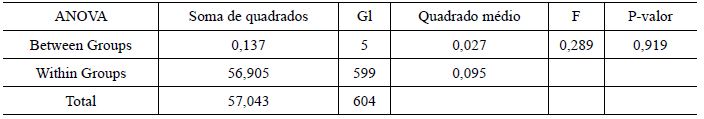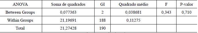 A análise de variância, na qual se testa a hipótese de que não há diferença entre as médias das proporções, possibilitou concluir que tais diferenças são estatisticamente significativas (p<0,05), de acordo com a Tabela 3.