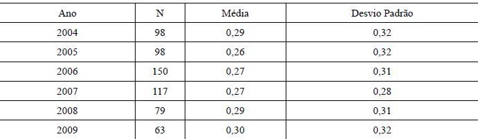 A Tabela 6, a seguir, mostra as médias e desvios-padrão da proporção de mulheres em relação à quantidade de autores nos artigos publicados no Congresso da ANPCONT, no período analisado.