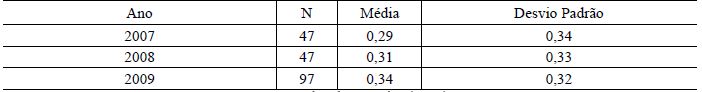 Considerando apenas três observações (anos 2007, 2008 e 2009) do Congresso da ANPCONT, não foram realizados os cálculos estatísticos (correlação e teste de médias), da forma como realizado para os outros dois grupos de eventos científicos.