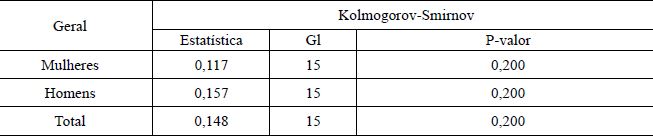 A Tabela 8 apresenta o teste de normalidade, considerando toda a população analisada, ou seja, homens e mulheres dos três grupos de eventos: EnANPAD, USP e ANPCONT. O resultado mostra p-valor > 0,05, podendo-se inferir que os dados são de uma população normal.
