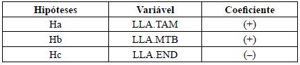 Pelos resultados esperados, conforme o Quadro 1, as variáveis interativas que representam a interação entre o lucro e tamanho (LLA.TAM) e entre o lucro e oportunidades de crescimento (LLA.MTB) devem apresentar coeficientes positivos, de forma a confirmar o impacto positivo das variáveis tamanho e market-to-book sobre a informatividade dos lucros contábeis. De forma oposta, para a variável interativa entre o lucro e endividamento (LLA.END) espera-se um coeficiente negativo, evidenciando o impacto do endividamento negativo sobre a informatividade dos lucros contábeis.