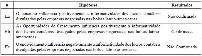 De forma conclusiva, analisando o conjunto de evidências levantadas sobre todos os resultados gerados, tanto pela amostra de trabalho, quanto pelas sub-amostras, pode-se estabelecer que, entre as variáveis estudadas, somente a variável oportunidades de crescimento, representada pelo índice market-to-book, exerceu influência sobre a informtividade dos lucros contábeis divulgados pelas empresas negociadas nos principais mercados acionários da Argentina, Brasil, Chile, México e Peru durante o período analisado, de 2005 a 2008.
