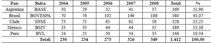 Foram selecionadas empresas não financeiras de cinco1 países na América Latina (Argentina, Brasil, Chile, México e Peru) nos anos de 2004 a 2008. Os critérios adotados para a inclusão de uma empresa na amostra de trabalho da pesquisa foram: