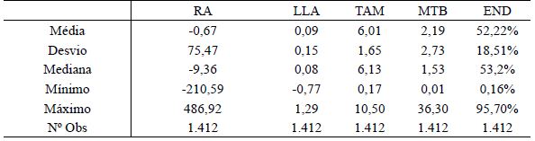 Para o conjunto de dados extraídos, de acordo com os procedimentos indicados pela metodologia, seguem abaixo as estatísticas descritivas das variáveis utilizadas nos modelos adotados: