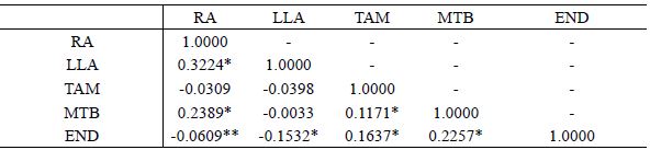 Na Tabela 3, na qual se apresentam as correlações entre as variáveis, observa-se que a variável Retorno Anormal (RA) possui correlação negativa com as variáveis tamanho (TAM) e endividamento (END), e positiva com a variável market-to-book (MTB). Apesar da variável tamanho (TAM) apresentar correlação negativa, a mesma não apresentou significância estatística. As outras variáveis, market-to-book (MTB) e endividamento (END) apresentaram significância estatística (1% e 5% respectivamente) e valores, positivo e negativo, respectivamente.