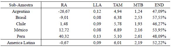 Os números tabulados na Tabela 4 apresentam uma grande dispersão entre os retornos anormais (RA) médios calculados para os mercados/países no período analisado, enquanto o menor retorno anormal foi observado no mercado argentino (-26,67), o maior foi registrado no mercado peruano (40,32). De forma oposta, as outras variáveis de interesse do estudo registraram uma menor dispersão, apresentando valores próximos às médias registradas para a amostra de trabalho (América Latina). Em relação a variável tamanho (TAM), o maior valor foi observado no México (6,89). Enquanto o maior valor médio para as oportunidades de crescimento (representado pelo MTB) foi registrado pelo mercado do Peru (2,61), o maior endividamento (END) médio foi apresentado no mercado brasileiro (57,55%).