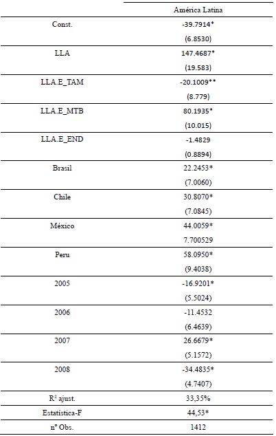 Seguindo a abordagem de estimativa Pooled, para se verificar o resultado dos dados nas empresas selecionadas nos mercados da América Latina o modelo (2) foi aplicado sobre a amostra de trabalho.