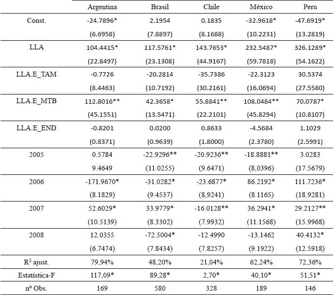 Na Tabela 5, se encontram listados os resultados da aplicação do modelo sobre as subamostras de cada um dos países estudados. De forma similar ao resultado encontrado sobre a amostra de trabalho, a variável Lucro Líquido Ajustado apresentou valor positivo e significante (1%) para todas as subamostras. Este resultado indica que o lucro contábil é positivamente relacionado com os retornos das ações em todos os mercados analisados na América Latina.