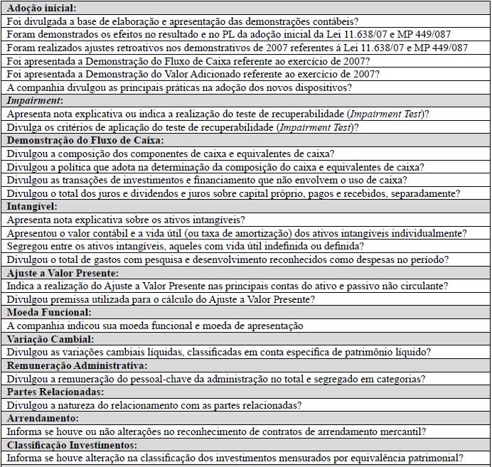 Para que fosse possível concluir sobre o objeto de estudo, adotou-se o Índice de Observância às Práticas de Convergência (IOPC) utilizados por Lima et al. (2010). A métrica sugerida na pesquisa, leva em consideração as recomendações da Lei 11.638/2007, para adoção inicial das IFRS, bem como do Pronunciamento Técnico CPC n° 13. O Quadro 2 apresente os itens observados na pesquisa.