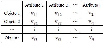 Pawlak (1982) descreve em seu trabalho a forma como ocorre o funcionamento do processo de mineração de dados. Inicialmente descreve-se uma Matriz de informação, onde as linhas são os experimentos ou objetos da pesquisa e as colunas descrevem as variáveis coletadas ou atributos. A Tabela 1 descreve o modelo da tabela de dados desenvolvida por Pawlak (1982).