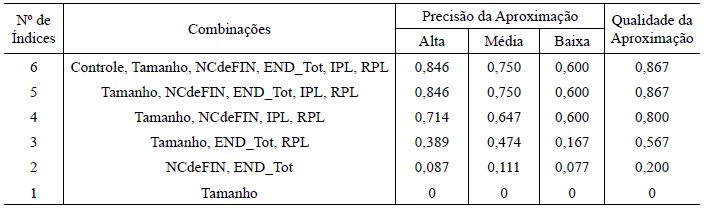 De acordo com Pawlak (1982), a TCA permite a análise do menor número de variáveis que possuem maior peso na discriminação do atributo de decisão, neste caso o grau de aderência as normas internacionais. Nesta perspectiva, observa-se na Tabela 2 que, com a utilização de apenas quatro (“Tamanho, Necessidade de Financiamento, Imobilização do Patrimônio Líquido e Rentabilidade do Patrimônio Líquido”) dos seis índices pesquisados, ainda é possível se obter uma alta qualidade de aproximação (80%) na explicação da aderência dessas empresas as normas internacionais de contabilidade.
