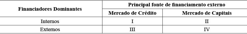 Nobes (1998) afirma que os fatores que determinam o propósito das publicações em países culturalmente autossuficientes são o tipo de financiadores dominantes (se são internos ou externos), e a principal fonte de financiamento externo das entidades (se são do mercado de crédito ou do mercado de capitais). Como financiadores internos, entende-se por aqueles que possuem a capacidade de obter informações junto à administração da entidade de modo oportuno e frequente, tais como acionistas majoritários, bancos e governos. Já com relação aos financiadores externos, entende-se por aqueles que não pertencem à direção da entidade, nem possuem com ela um relacionamento privilegiado que lhes permita obter informações oportunas e frequentes, tais como os acionistas minoritários. Quanto às principais fontes de financiamento, os países foram classificados de acordo com sua predominância, ou seja, países onde as entidades buscam financiamento externo principalmente junto ao sistema bancário, com ou sem subsídios governamentais, e onde as entidades são financiadas principalmente pelo mercado de crédito. O mercado de capitais constitui outra opção de financiamento das entidades. Um resumo do modelo proposto pode ser observado pela seguinte matriz: