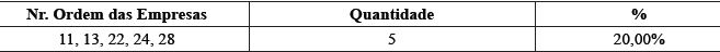 Para fins de simplificação, nas tabelas seguintes foi lançado somente o número de ordem das empresas, conforme listado na tabela 5. A análise dessas tabelas permite chegar às seguintes conclusões: