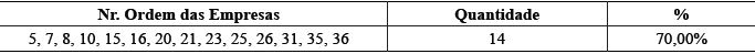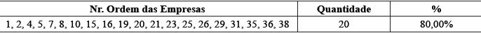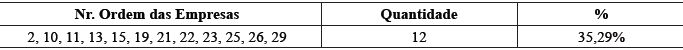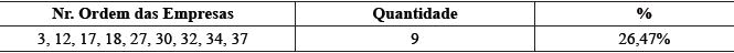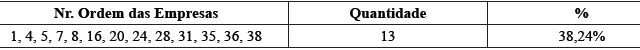 Portanto, para fins de obtenção e análise dos percentuais de ocorrência que se evidencia a seguir, utilizou-se, como número de empresas válidas para o estudo, 34 empresas.