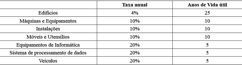 Os critérios fiscais básicos de depreciação estão consolidados no Regulamento do Imposto de Renda (Decreto nº 3000/99), através de seus artigos 305 a 323. A relação dos bens e suas respectivas vidas úteis e taxas máximas de depreciação constam das Instruções Normativas da SRF 162 (31.12.1998) e 130 (10.11.1999). As taxas máximas anuais de depreciação admitidas pelo Fisco são geralmente para uso normal dos bens em um turno de oito horas diárias, e são apresentadas a seguir: