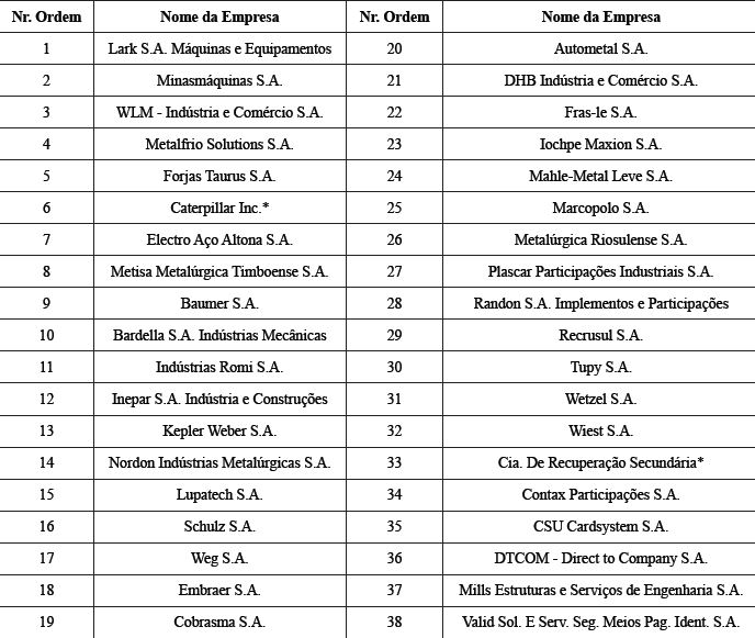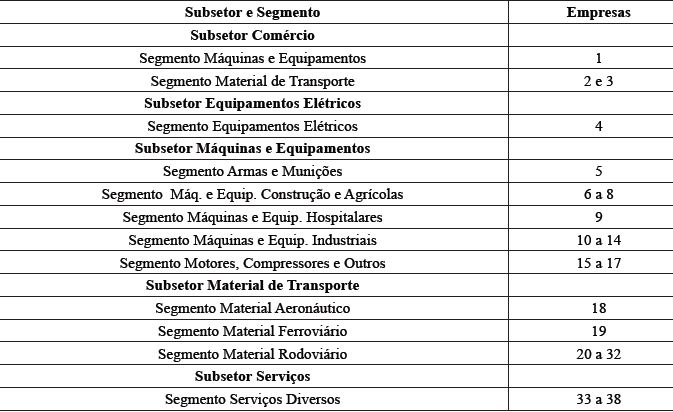 Para o presente estudo, foram selecionadas 38 empresas do Setor de Bens Industriais, conforme classificação da BM&F Bovespa, que classifica as empresas listadas em setores específicos de atividade, representando assim uma amostra intencional de dados, o que também resulta numa limitação desta pesquisa.