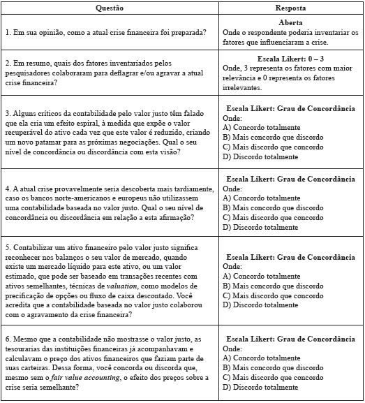 Para aproveitar ao máximo o conhecimento dos especialistas, a primeira pergunta geral sobre a crise era totalmente aberta, permitindo a interação entre o entrevistado e o entrevistador. Em seguida, foi apresentado um inventário com possíveis explicações para a deflagração ou o agravamento da crise. Então, o entrevistado foi estimulado a atribuir notas de 0 à 3, de acordo com a menor ou maior relevância do item. Por fim, foi aplicada uma série de perguntas fechadas com foco na contabilidade a valor justo. Contudo, nesses casos, também buscou-se estimular os comentários dos entrevistados, com o objetivo de enriquecer o trabalho.