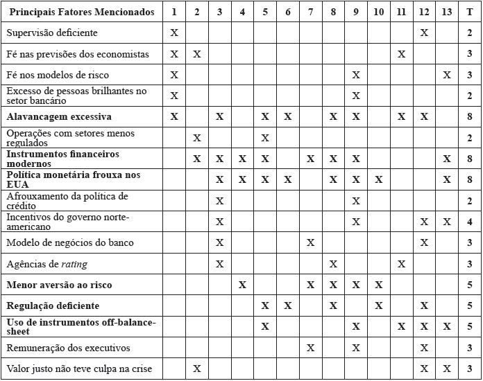 Com base no quadro 2, percebe-se que os principais fatores que ocasionaram a crise financeira, na opinião dos especialistas foram: alavancagem excessiva por parte dos bancos, utilização de instrumentos financeiros modernos, e política monetária frouxa por parte do governo norte-americano. Esses três fatores foram mencionados como determinantes da crise por oito dos treze especialistas entrevistados.