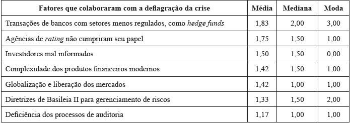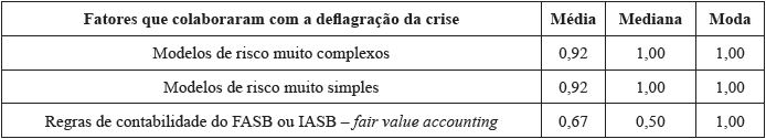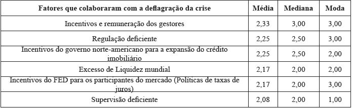 Com base no quadro 4, nota-se que dentre os fatores considerados relevantes para a deflagração da crise mundial encontram-se aspetos relacionados ao gerenciamento de riscos e à complexidade dos instrumentos financeiros modernos. De acordo com o ex-presidente do Banco Central e sócio da Gávea Investimentos, Arminio Fraga, “a administração de risco tinha se tornado, ilusoriamente, uma ciência exata, e prometia um grau de controle muito maior do que era possível na realidade”.