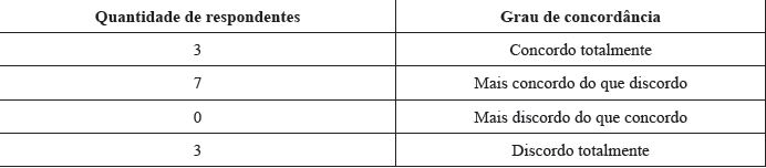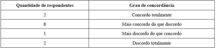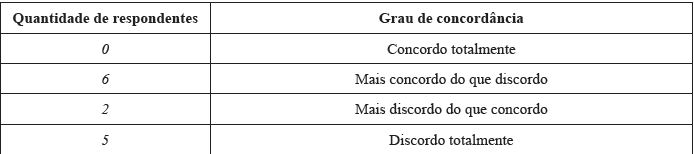 Em linha com a questão 3, o quadro 8 evidencia que quase metade dos entrevistados concorda que a contabilidade colaborou com o agravamento da crise. No entanto, dos entrevistados que concordaram com a proposição, nenhum se posicionou como “concordo totalmente”, e a parte dos entrevistados que descordou da proposição, em sua grande maioria, posicionou-se no maior nível de discordância. Em termos médios, poderíamos dizer que os entrevistados mais discordam do que concordam da afirmação, porém, devido ao número reduzido da amostra, essa conclusão não pode ser assumida sem a análise dos outros resultados.