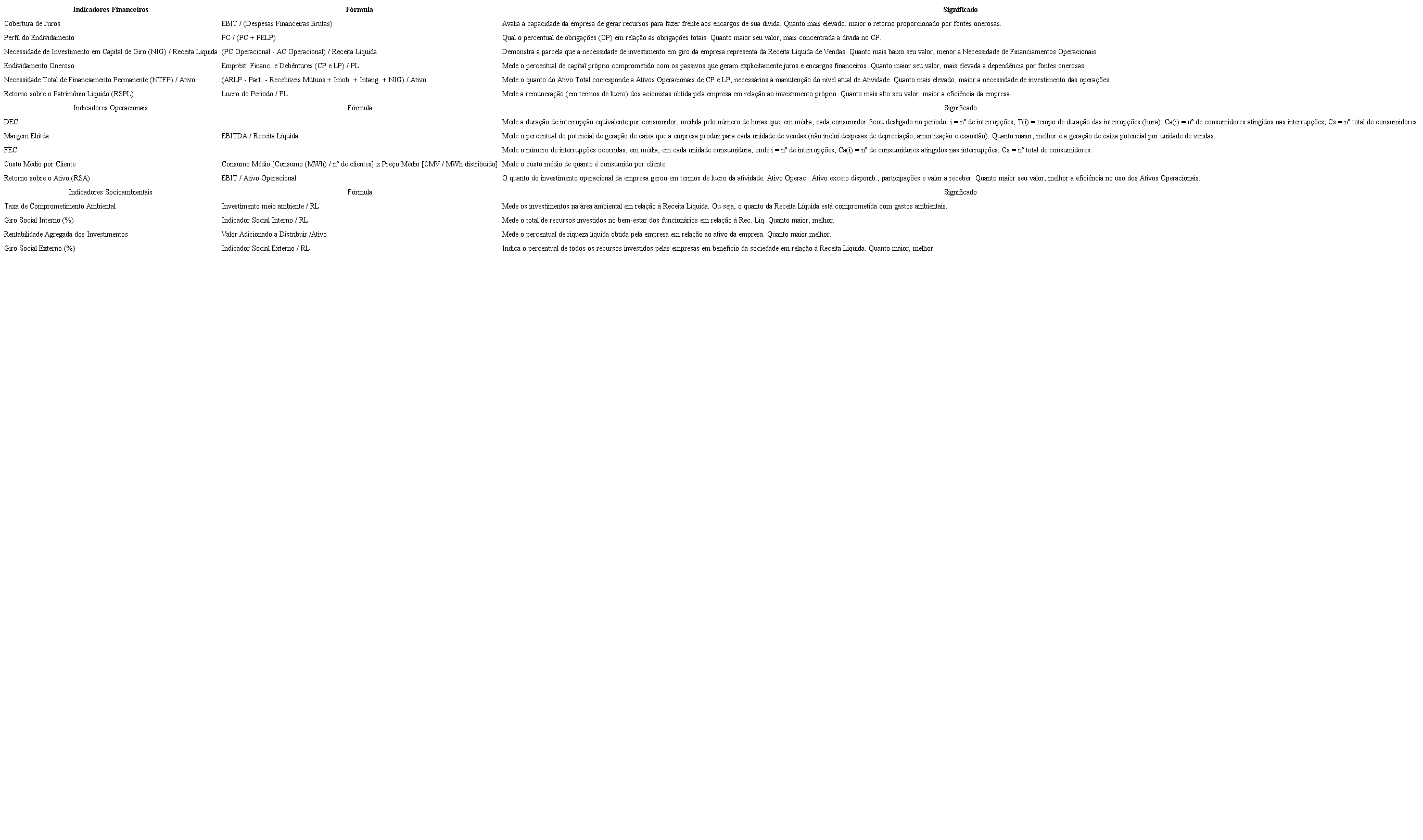 b) Perspectiva Operacional (15 indicadores): Consumo Médio Mensal, Preço Médio (R$/MWh), Cliente por Empregado, Despesa Financeira Unitária (R$/MWh), Perdas de Vendas, Geração Operacional de Caixa (EBIT), Margem Bruta ou Margem Ebit, Razão Operacional, Margem Ebitda, DEC, FEC, Rentabilidade Financeira sobre o Ativo Total (RFAT), Retorno sobre o Ativo (RSA), Rentabilidade Financeira sobre o Ativo Operacional (RFAO) e Taxa de recuperação de Caixa;