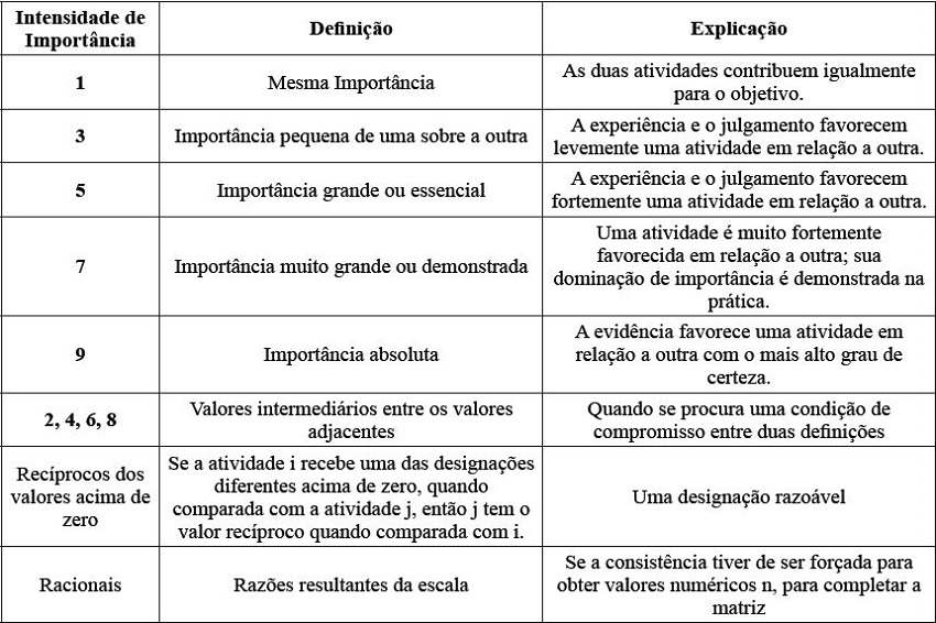 Pode-se perceber, segundo Gomes, Gonçalez-Araya e Carignano (2004) e Anderson, Sweeney e Williams (2005), que a escala define apenas o que é mais importante e quão mais importante. No caso de, por exemplo, um critério i ter importância grande ou essencial em relação a j, será atribuído o valor 5 da escala para a comparação de i em relação a j (linha i e coluna j da matriz de decisão). Já na comparação de j em relação a i (linha j e coluna i da matriz de decisão) será atribuído o inverso deste valor, ou seja, 1/5. Ou seja, para o menos importante, a comparação assume o valor inverso ou recíproco da escala original.