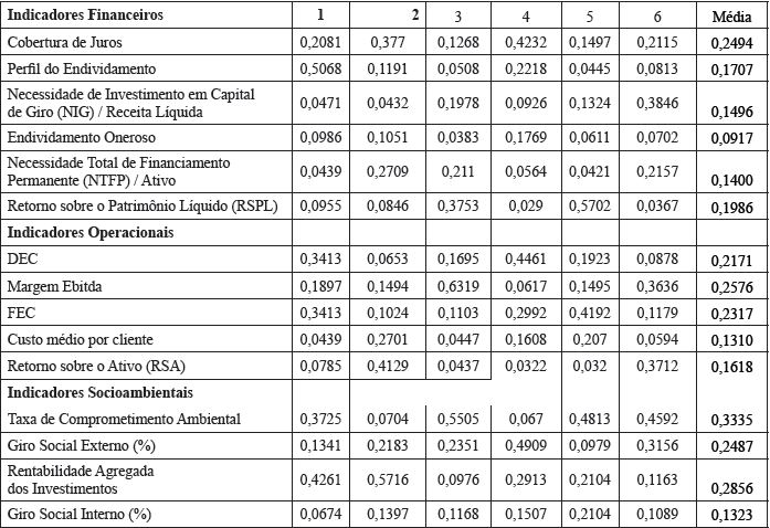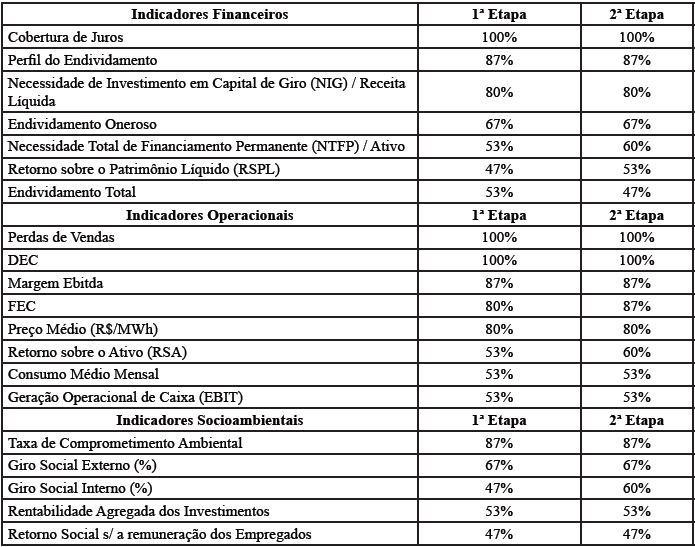 Já na perspectiva operacional, observa-se certo equilíbrio entre os indicadores, como uma leve vantagem para os indicadores de Margem Ebitda, FEC e DEC, que são os três mais importantes. Por fim, a análise da perspectiva socioambiental mostra que a Taxa de Comprometimento Ambiental e a Rentabilidade Agregada dos Investimentos são, respectivamente, os dois indicadores mais relevantes, respondendo juntos por quase 62% de toda importância da perspectiva socioambiental.