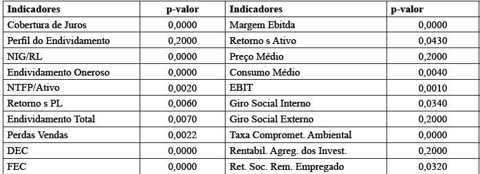 O teste de correlação (Spearman) aplicado aos indicadores teve como objetivo verificar se existiam indicadores correlacionados que poderiam estar sinalizando uma mesma dimensão da análise de desempenho multicriterial. Os resultados revelaram que, na dimensão financeira, o indicador que mede o Endividamento Total estava altamente correlacionado com o Endividamento Oneroso (0,590 e p-valor = 0,000) e a Necessidade de Investimento em Capital de Giro em relação à Receita Líquida (-0,469 e p-valor = 0,002), sendo descartado da lista de índices financeiros.