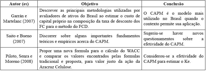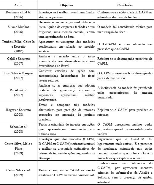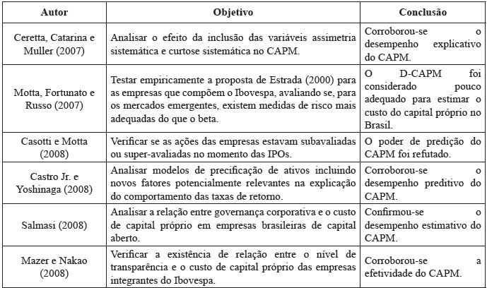 Vários pesquisadores têm desenvolvido trabalhos sobre o CAPM e variantes no mercado brasileiro, para testar sua adequação e poder explicativo no que se refere a ativos individuais ou portfolios. Nos Quadros 1, 2 e 3 são apresentados alguns deles, publicados nos últimos anos.