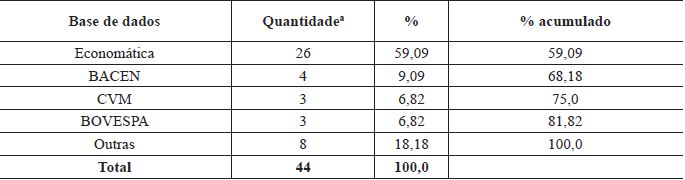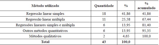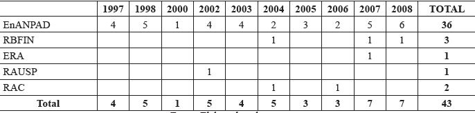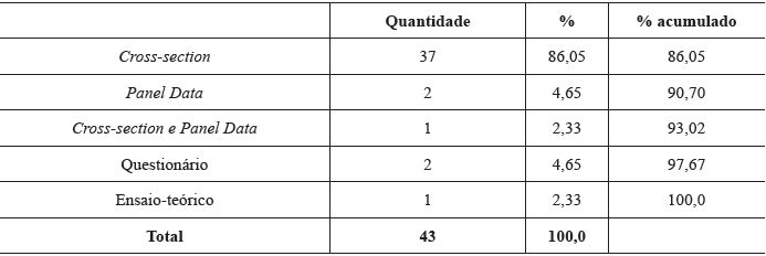 Foram investigados os anais de 1997 a 2008 dos EnANPADs- um dos mais importantes congressos de administração e contabilidade do país, que recepciona boa parte dos artigos produzidos nestas áreas - portanto, um período de 12 anos, além de seis periódicos brasileiros na área de administração e economia, classificados no Qualis-CAPES como de elevado impacto, a saber: Revista Brasileira de Finanças (RBFIN), Revista de Administração de Empresas (RAE), Revista de Administração da Universidade de São Paulo (RAUSP), Revista de Administração Contemporânea (RAC), Revista de Administração Contemporânea (RAC-e), Revista Brasileira de Economia (RBE), meios nos quais se procedeu uma varredura em busca de artigos, que compuseram a amostra de 43 pesquisas (vide TAB. 1). Cabe ressaltar que nos dois últimos periódicos, não foram encontrados artigos sobre o tema no período. Nos anos de 1999 e 2001, também não foram identificadas publicações sobre o modelo. Um artigo foi excluído da amostra por ter sido considerado idêntico a outro já contabilizado (em periódico), pois, além de não reforçar os resultados obtidos, seria redundante.