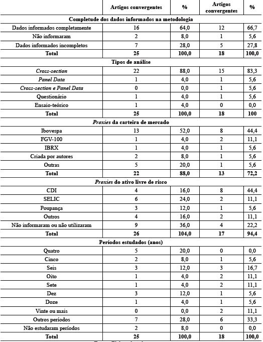 No que se refere aos períodos estudados, nos artigos convergentes prevaleceram “outros períodos” (28%), que abarcaram testes de um a três anos, seguido de quatro anos (20%), e apenas 16% dos trabalhos investigaram períodos mais longos como a partir de dez anos (16%). Portanto, na maioria deles, não foi preciso realizar trabalhos sobre períodos longos para corroborar o modelo. Por outro lado, nas pesquisas divergentes os “outros períodos” (aproximadamente 33%) prevaleceu, os artigos referentes a seis anos foram quase 17%, e cerca de 11% dos trabalhos abordou períodos bastante longos, vinte anos ou mais. E, se por um lado há insuficiência de bases de dados referentes a períodos extensos, por outro, o fato de os testes com períodos menores poderem aumentar a eficiência das regressões (e.g. Bruni, 1998), podem ter favorecido a preferência dos pesquisadores, pois seu manuseio é mais simples. Contudo, mesmo nas análises com períodos mais amplos, ou mais curtos, houve refutação do CAPM.