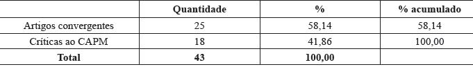 Por meio deste levantamento referente às pesquisas que empreenderam análises teóricas e, sobretudo, empíricas sobre o modelo CAPM e suas variantes, foi possível verificar como os autores têm abordado esse objeto de estudo, com quais métodos, quais tipos de dados, tipos de análise preferidos, testes efetuados, tipos de ações, média de períodos analisados, análises de ativos individuais ou de portfolios, bem como se as conclusões dessas pesquisas convergem para a teoria do CAPM ou se a contestam.