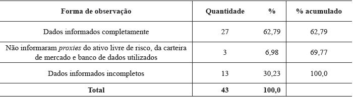 No cruzamento de algumas variáveis investigadas com os artigos que confirmaram ou refutaram a eficiência do modelo CAPM, aproximadamente 28% de ambos os trabalhos - sugerindo um empate técnico - informaram os dados de forma incompleta. Assim, não se pode supor que esse fato seja influente para criticar a efetividade da teoria do CAPM, no Brasil. Quanto ao tipo de análise, 88% dos artigos convergentes e pouco mais de 83% dos divergentes realizaram cross-section, o que tampouco permite afirmar que tenha provocado efeitos diferentes.