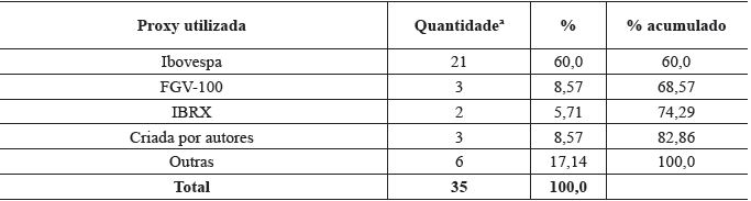 No que tange às proxies da carteira de mercado, 52% dos trabalhos que corroboraram a teoria, e aproximadamente 44% dos que sinalizaram sua ineficiência, utilizaram o Ibovespa. Logo, mesmo que seja indicada como uma proxy inapropriada para seu fim (um índice concentrado em poucos ativos), na amostra analisada esse fato parece contribuir mais para confirmar a eficiência do CAPM, no Brasil, que o contrário.