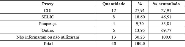 Eentre as pesquisas que revelaram qual a proxy do ativo livre de risco aplicada, a maioria dos convergentes (24%) baseou-se na SELIC, seguida do CDI e da poupança (ambos com 16%), estas criticadas por serem inacessíveis ao investidor privado. Naqueles que refutaram o CAPM, prevaleceu, com aproximadamente 44%, a utilização do CDI. Dessa maneira, percebe-se que, a maioria dos artigos preferiu o CDI, e não a poupança - apontada como a mais adequada para estudos desse tipo no Brasil (e.g. Silva, Melo e Pinto, 2009). Entretanto, mesmo inexistindo uma proxy totalmente ajustada à teoria do modelo, vários testes com as mesmas confirmaram o desempenho positivo do CAPM ao utilizá-las. Por outro lado, entre as pesquisas que refutaram a teoria, predominou a aplicação do CDI, o que pode ter auxiliado para que isso acontecesse, mas não se sabe se outros fatores contribuíram também.