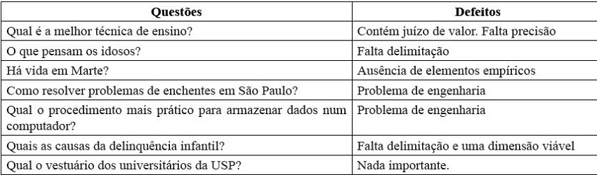 Neste contexto, o Quadro 1 apresenta alguns problemas que podem ocorrer nas questões de pesquisa em trabalhos científicos.
