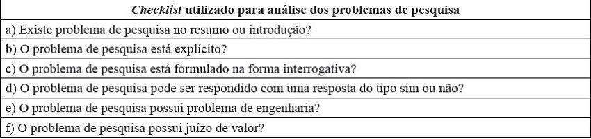 As análises foram efetuadas com base na revisão de literatura, observando os seguintes itens: se o problema de pesquisa consta na introdução, se ele está explícito e na forma interrogativa, se não possui juízo de valor ou problema de engenharia, e se a resposta ao problema pode ser do tipo sim ou não.