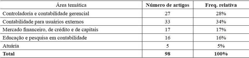 Embora todos os artigos tenham que observar uma adequada formulação de pesquisa, o destaque foi para a área temática Educação e Pesquisa em Contabilidade, que apresentou o melhor percentual em relação às demais áreas. Uma possível explicação pode ser o cuidado específico por parte dos pesquisadores para com as observações metodológicas dos artigos, inerentes às pesquisas e discussões que fazem sobre o tema.