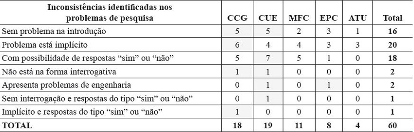 As inconsistências mais recorrentes na formulação dos problemas de pesquisa foram problemas de pesquisa implícitos, e que podem ser respondidos com respostas simples do tipo “sim” ou “não”. Embora não seja a inconsistência mais recorrente, chama atenção a constatação de 16 artigos sem a identificação do problema na introdução. Nenhuma inconsistência com problema de juízo de valor foi identificado.