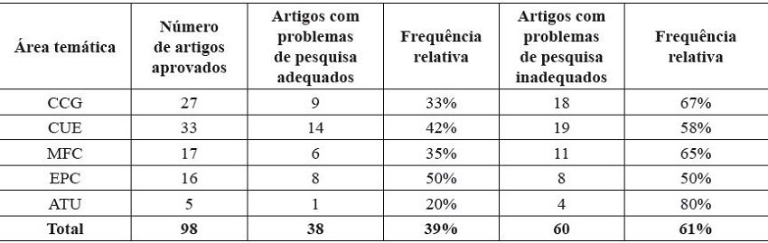 Destaca-se o fato de um Congresso classificado pela CAPES como E1, ou seja, de maior pontuação possível na área, tenha encontrado um total de 61% de artigos apresentando alguma inconsistência na formulação do problema de pesquisa. Conforme destacado por Campbell et al. (1982), a formulação de perguntas de pesquisa deve ser realizada de forma cuidadosa, refletindo a abertura de novos problemas de investigação e contribuindo para a solução de controvérsias advindas de longa data.