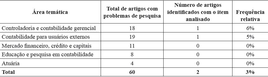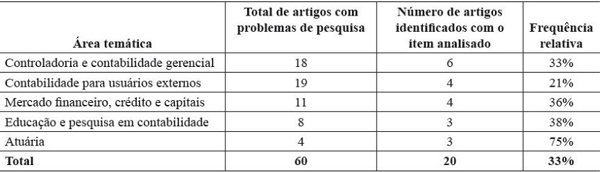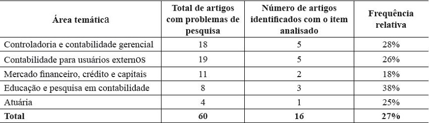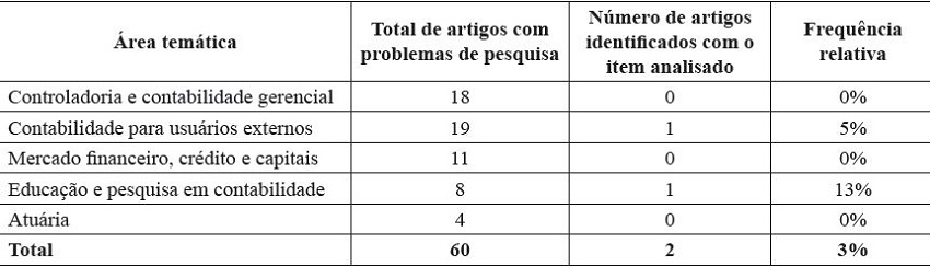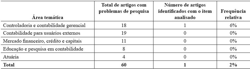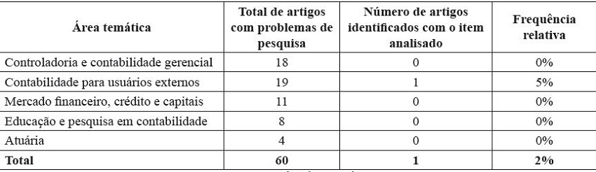 Dessa forma, observa-se na Tabela 4 que 20 artigos não contemplaram uma pergunta de pesquisa que direcionasse o estudo. Em valores absolutos, constata-se que, com exceção da área temática Controladoria e Contabilidade Gerencial, as demais apresentam uma quantidade similar de artigos nesta condição. Entretanto, em valores relativos, esta inconsistência representou 75% na área temática Atuária.