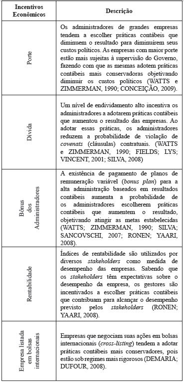 Os incentivos econômicos mencionados na tabela acima refletem as razões mais recorrentes identificadas na literatura de accounting choice. Os três primeiros mencionados referem-se à teoria positiva de contabilidade proposta por Watts e Zimmerman (1990). A rentabilidade, como indicado por Ronen e Yaari (2008) relaciona- se às expectativas das partes interessadas na empresa (stakeholders), bem como, em geral, são medidas de interesse dos administradores das empresas. Por fim, a dupla listagem em mercados de capitais com normas contábeis diferentes também influencia as escolhas de práticas contábeis realizadas pelas empresas. Nesse contexto, sempre que possível, uma empresa tenderá a adotar uma prática contábil aceita nos dois países para mitigar custos de conversão das demonstrações contábeis.