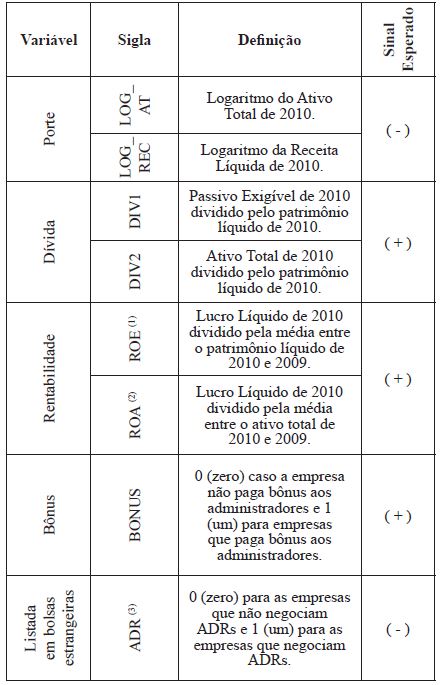 As variáveis explanatórias (independentes) presentes no modelo, as definições (proxies) escolhidas e o sinal esperado para cada uma delas estão descritos no quadro 3.