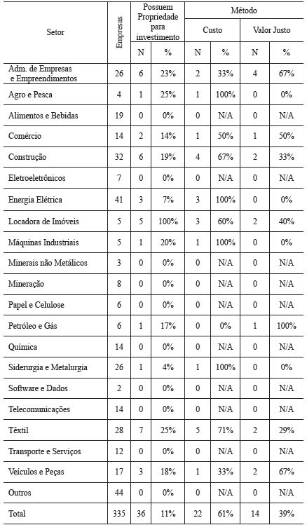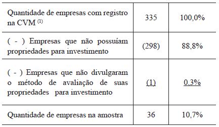 De um total de 335 empresas não financeiras de capital aberto analisadas, foram encontradas 37 empresas que atendiam a esse critério, isto é, possuíam propriedades para investimento, sendo que três empresas não indicavam o método de mensuração de suas propriedades para investimento. Porém, ao analisar as demonstrações financeiras dessas três empresas, foi considerado que duas empresas utilizavam o método do custo, enquanto que uma empresa teve de ser excluída da amostra, pois não foi possível identificar o método de mensuração de suas propriedades para investimento. Sendo assim, a amostra final utilizada nesse estudo foi composta por 36 empresas, como demonstrado na tabela 1.