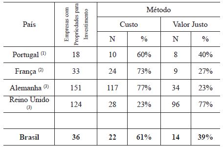 Ao analisarmos as escolhas do método de avaliação das propriedades para investimento das empresas brasileiras comparativamente com as escolhas feitas em outros países da Europa, percebe-se que a maioria das empresas brasileiras de capital aberto prefere avaliar suas propriedades para investimento utilizando o método do custo (61% das empresas), assim como observado em países como França, Alemanha e Portugal, o que indica que mesmo em contextos econômicos distintos (Brasil, Portugal, França e Alemanha), as escolhas contábeis parecem seguir na mesma direção.