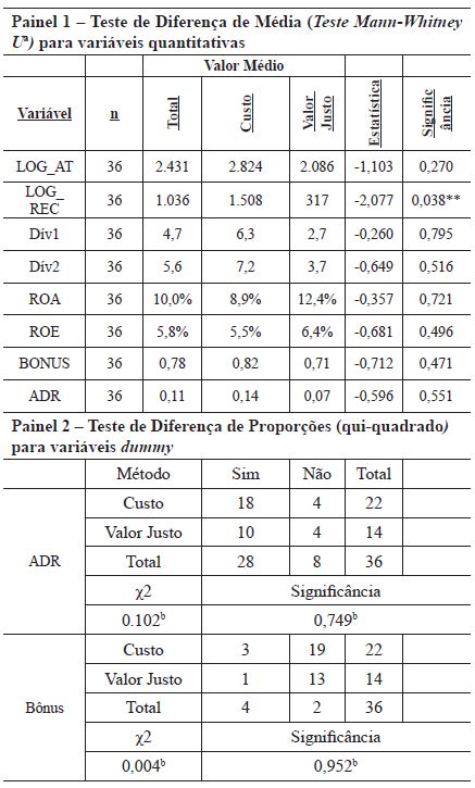 Sobre as variáveis qualitativas, a tabela demonstra que 28 empresas da amostra (77,7%) utilizam plano de remuneração variável para seus administradores, sendo esta uma prática predominante tanto nas empresas que utilizam o custo como nas empresas que utilizam o valor justo. Já em relação à participação em bolsas de valores estrangeiras, somente 4 empresas da amostra (12,5%) negociam suas ações em bolsas estrangeiras, sendo que 3 delas utilizam o método do custo e 1 utiliza o método do valor justo. Também para estas variáveis, não há diferença estatisticamente significativa (ao nível de significância de 10%).