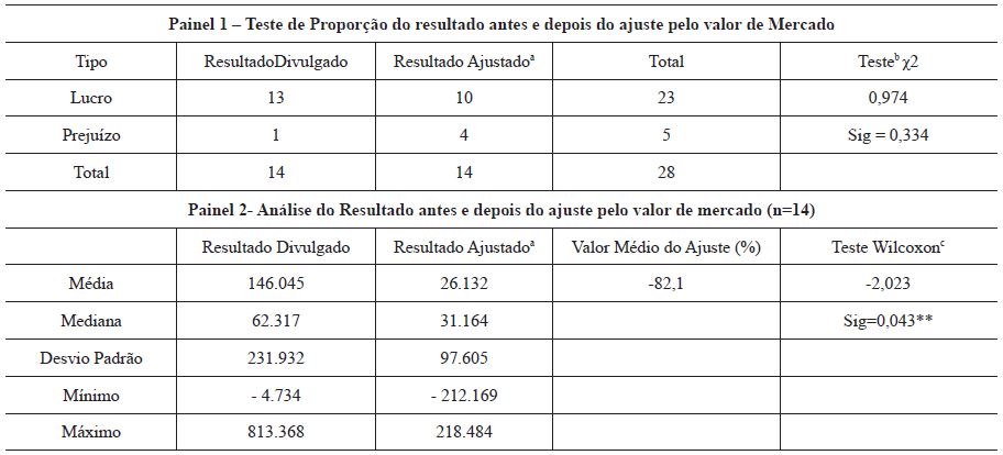 Na análise dos efeitos dos ajustes decorrentes da adoção do método do valor justo pelas empresas, o teste estatístico (teste qui-quadrado para uma tabela de contingência) demonstrou que não existem diferenças estatísticas nas proporções de empresas com lucro ou prejuízo apurado antes e depois do efeito do reconhecimento dos ganhos pela adoção do método. Apesar de a diferença não ser estatisticamente significativa, observou-se que todas as variações decorrentes da adoção do método de valor justo foram positivas, tendo um valor médio de R$ 279 milhões. Tal situação permitiu que três empresas obtivessem lucro no exercício de 2010 com o ajuste positivo decorrente da adoção do método de valor justo.