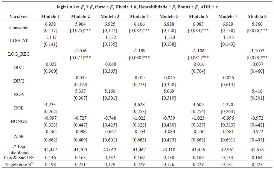 logit ( p ) = β0 + β1 Porte + β2 Dívida + β3 Rentabilidade + β4 Bônus + β5 ADR + ε
